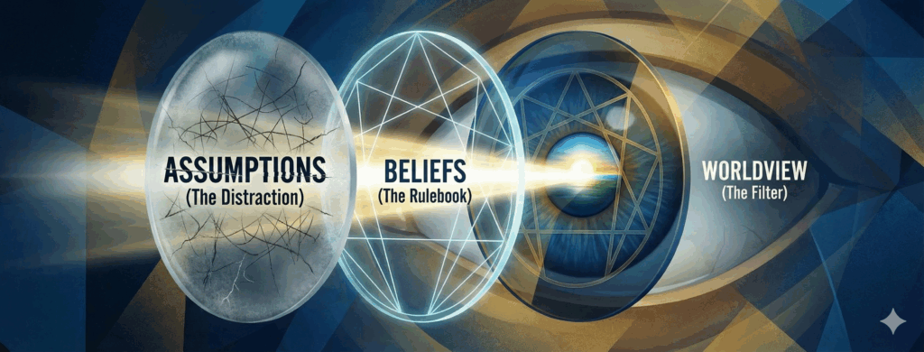 1. โลกทัศน์ (Worldview – รากฐาน): เลนส์แข็งเกร็งที่คุณใช้มองความเป็นจริง (เช่น “โลกนี้รุกล้ำอาณาเขตของฉัน” “ผู้เข้มแข็งเท่านั้นที่จะอยู่รอด” “ไม่มีที่ยืนสำหรับผู้แพ้” ฯลฯ ) สิ่งนี้เปลี่ยนยากที่สุด