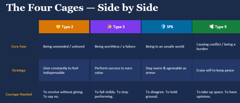 - กลยุทธ์ที่ฝังรากลึก: แต่ละไทป์มีกลยุทธ์ที่ถูกวางโปรแกรมไว้เพื่อหลีกเลี่ยงการถูกปฏิเสธ ซึ่งมันทำงานโดยอัตโนมัติอยู่ใต้จิตสำนึก