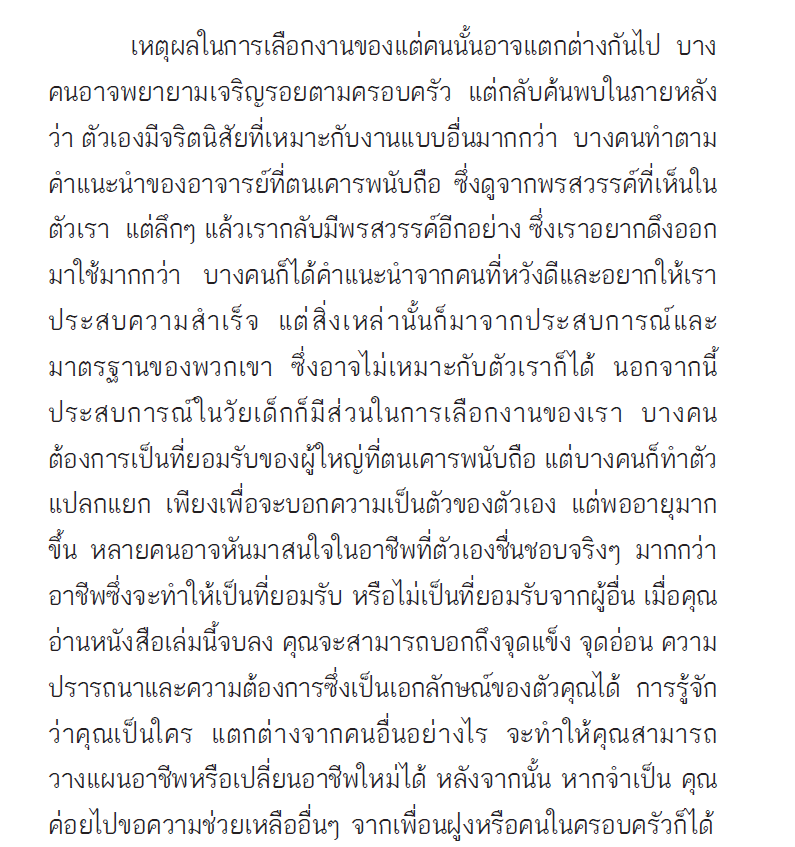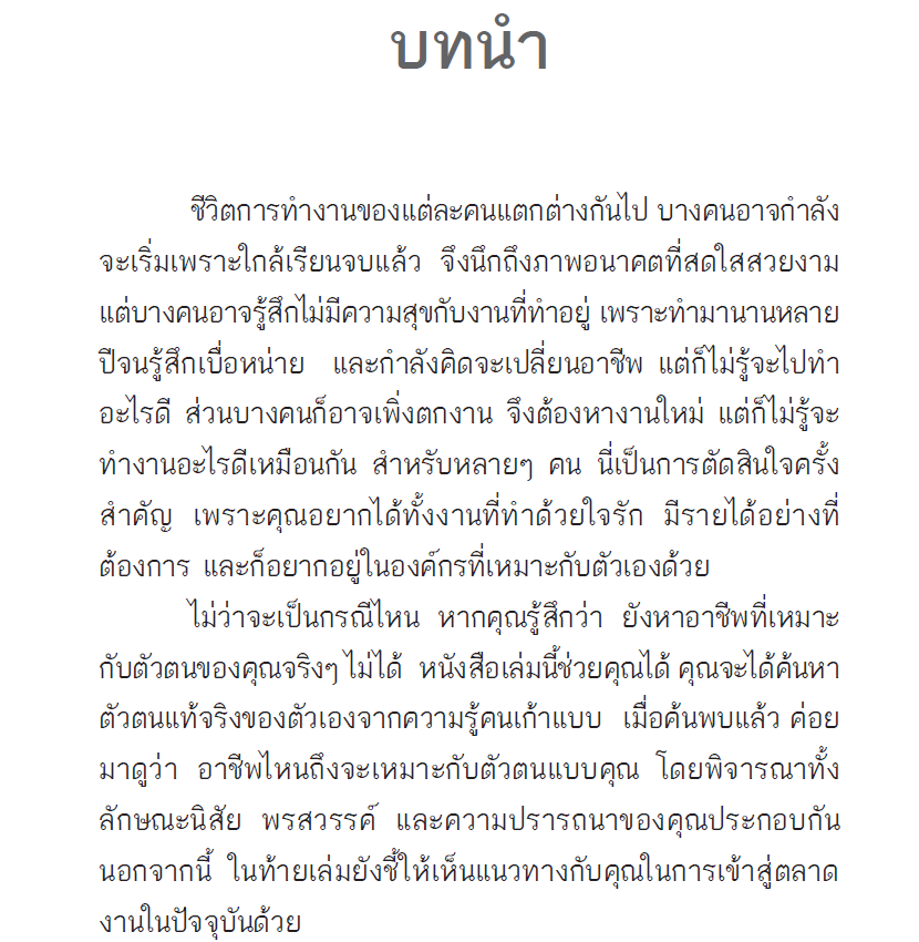 เนื้อหา: ชีวิตการทำงานของแต่ละคนแตกต่างกันไป บางคนอาจกำลังจะหางาน บางคนกำลังคิดจะเปลี่ยนอาชีพ ส่วนบางคนก็อาจเพิ่งตกงานจึงต้องหางานใหม่ สำหรับหลายๆ คน นี่เป็นการตัดสินใจครั้งสำคัญ เพราะคุณอยากได้ทั้งงานที่ทำด้วยใจรัก มีรายได้อย่างที่ต้องการ และก็อยากอยู่ในองค์กรที่เหมาะกับตัวเองด้วย ไม่ว่าจะเป็นกรณีไหน หากคุณรู้สึกว่า ยังหาอาชีพที่เหมาะกับตัวตนของคุณจริงๆ ไม่ได้ หนังสือเล่มนี้ช่วยคุณได้ คุณจะได้ค้นหาตัวตนแท้จริงของตัวเองจากความรู้คนเก้าแบบ แล้วค่อยดูว่า อาชีพไหนถึงจะเหมาะกับตัวตนแบบคุณ โดยพิจารณาทั้งลักษณะนิสัย พรสวรรค์ และความปรารถนาของคุณประกอบกัน นอกจากนี้ ในท้ายเล่มยังชี้ให้เห็นแนวทางสำหรับในการเข้าสู่ตลาดงานในปัจจุบันอีกด้วย